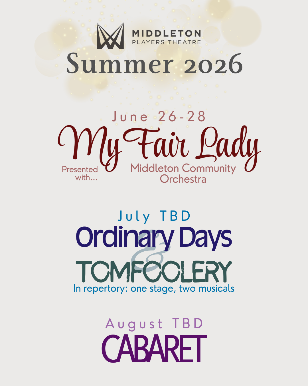 We’re so excited to be preparing for our Summer 2026 Season! Please stay tuned for finalized July & August show dates, ticket sales, and season ticket information.